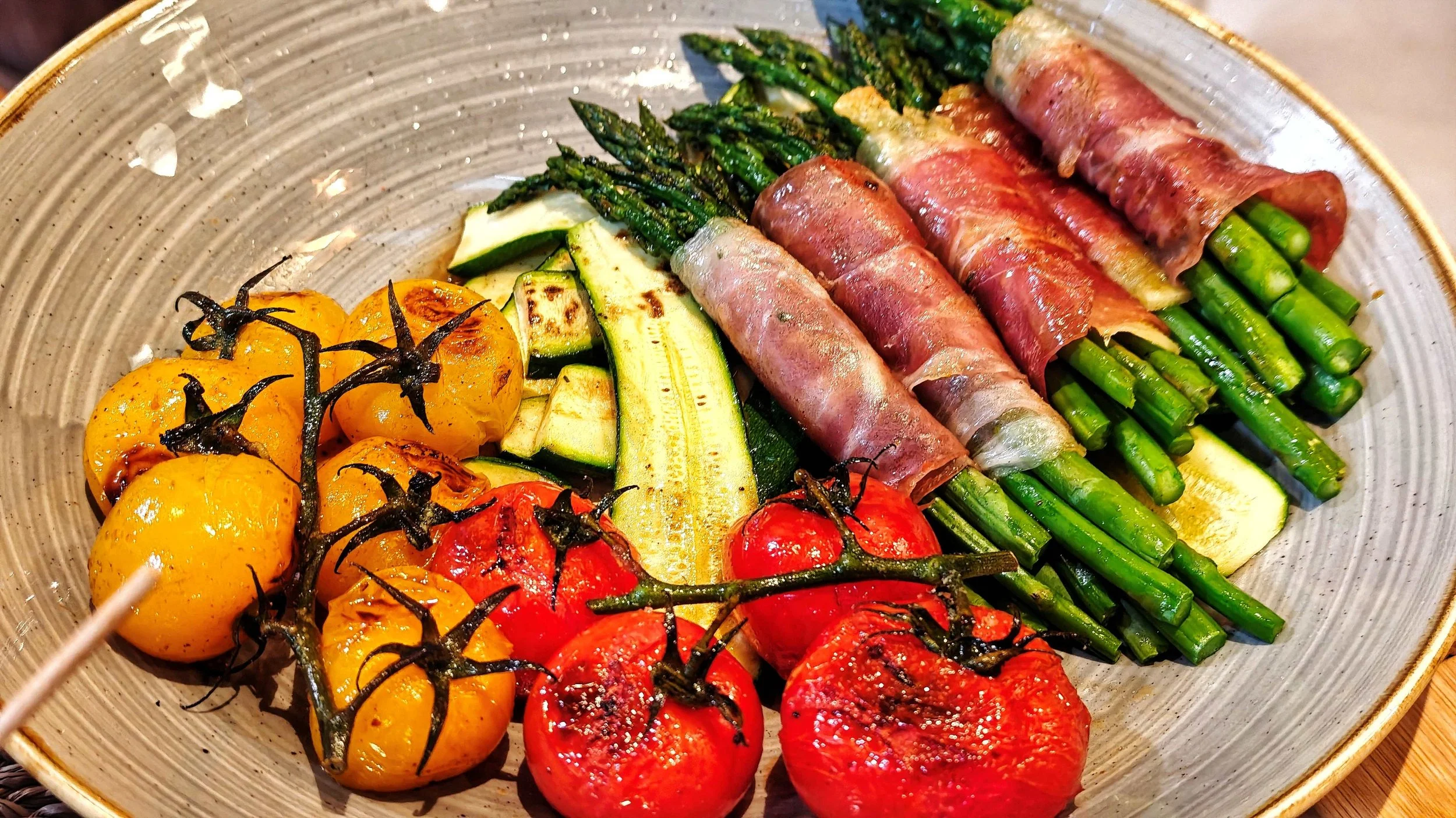 Bučke narežemo na debelejše trakove. Šparglje na hitro pokuhamo v kropu, jih oplaknemo z mrzlo vodo in v šopkih po 5 ovijemo s sirom ter pršutom.