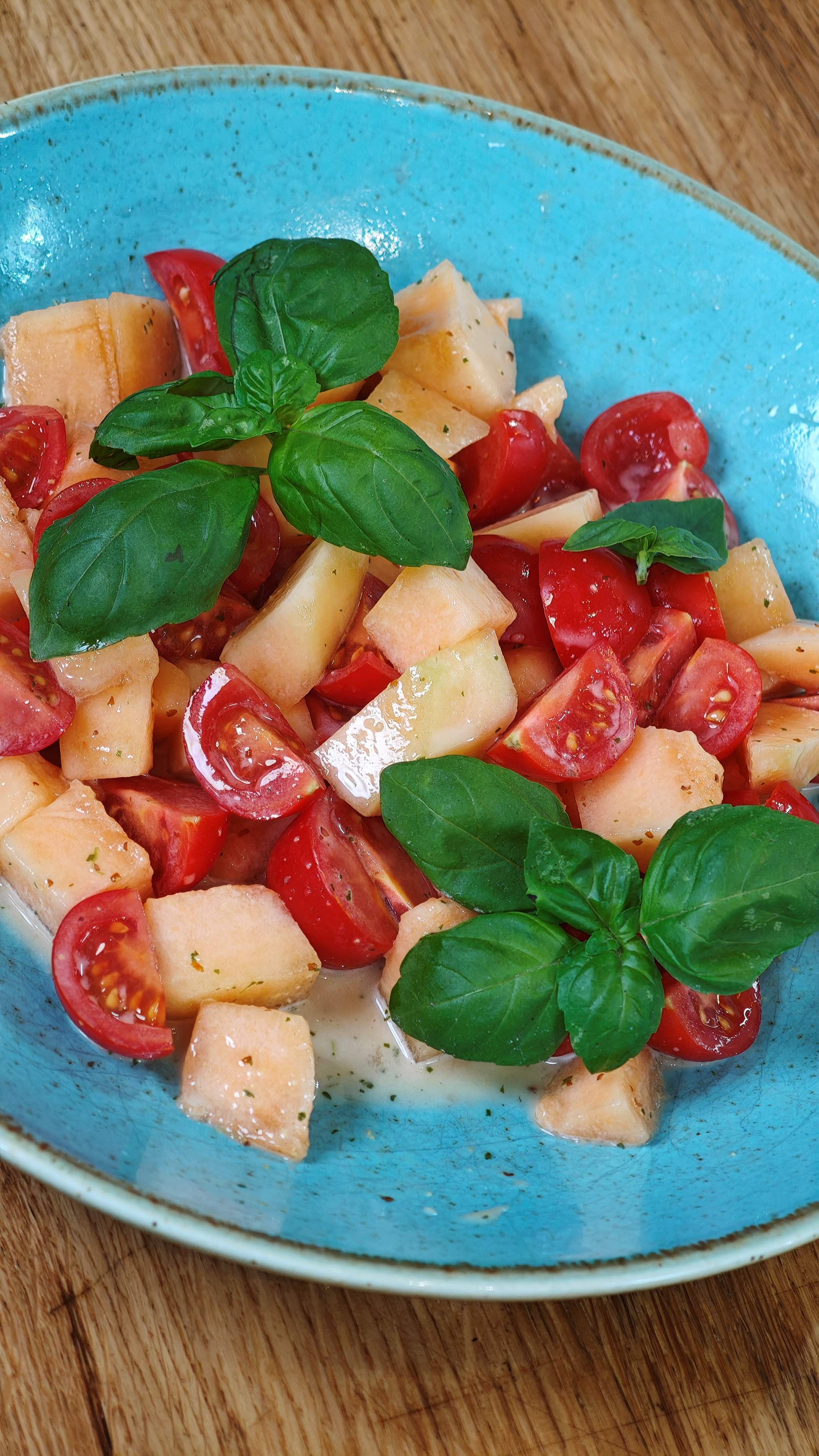 Za preliv vse sestavine premešamo v mešalniku. Nato s prelivom prelijemo melono in paradižnike. Dodamo svežo baziliko.